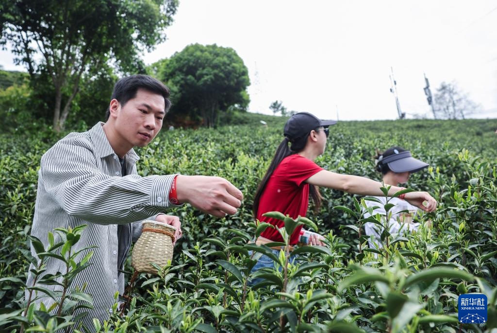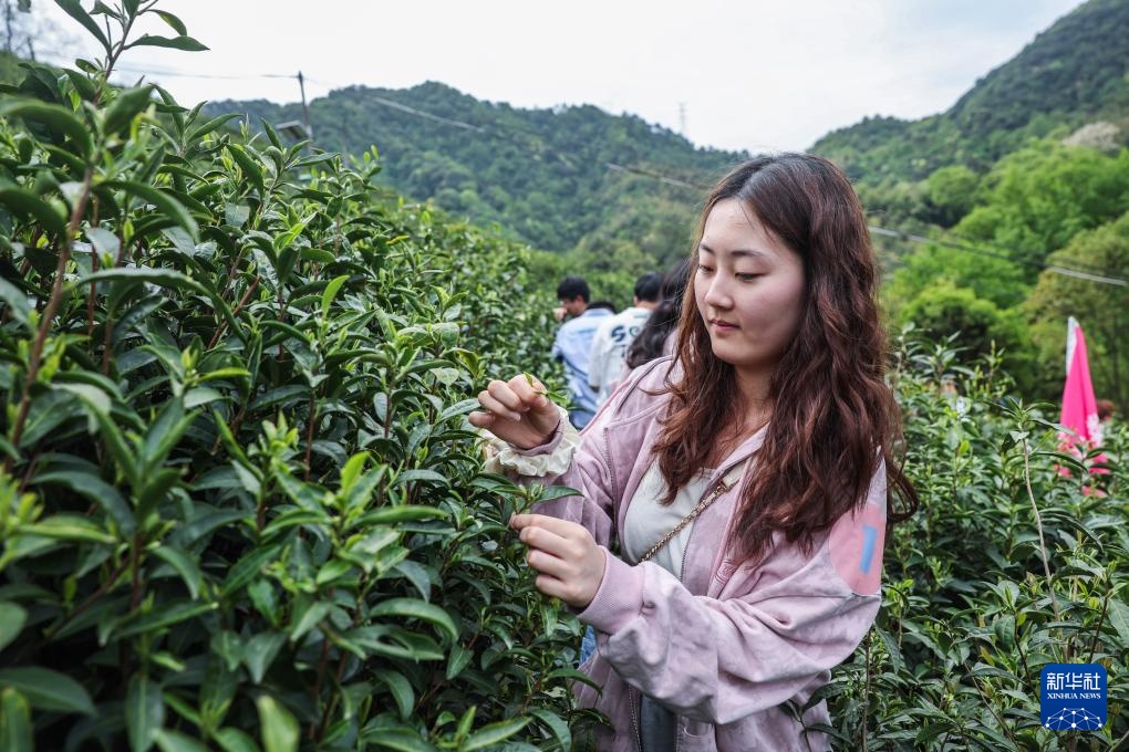 4月16日,参加茶文化主题活动的市民在建德市新安江街道岭后大坪茶园体验采茶。