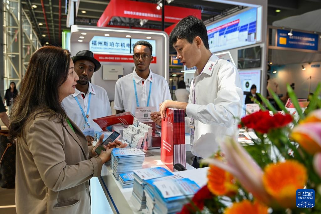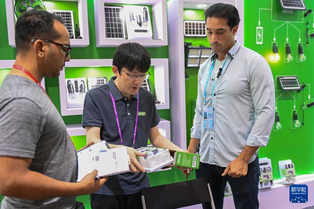 4月16日,参展商在第137届广交会的新能源展区向客商展示产品。