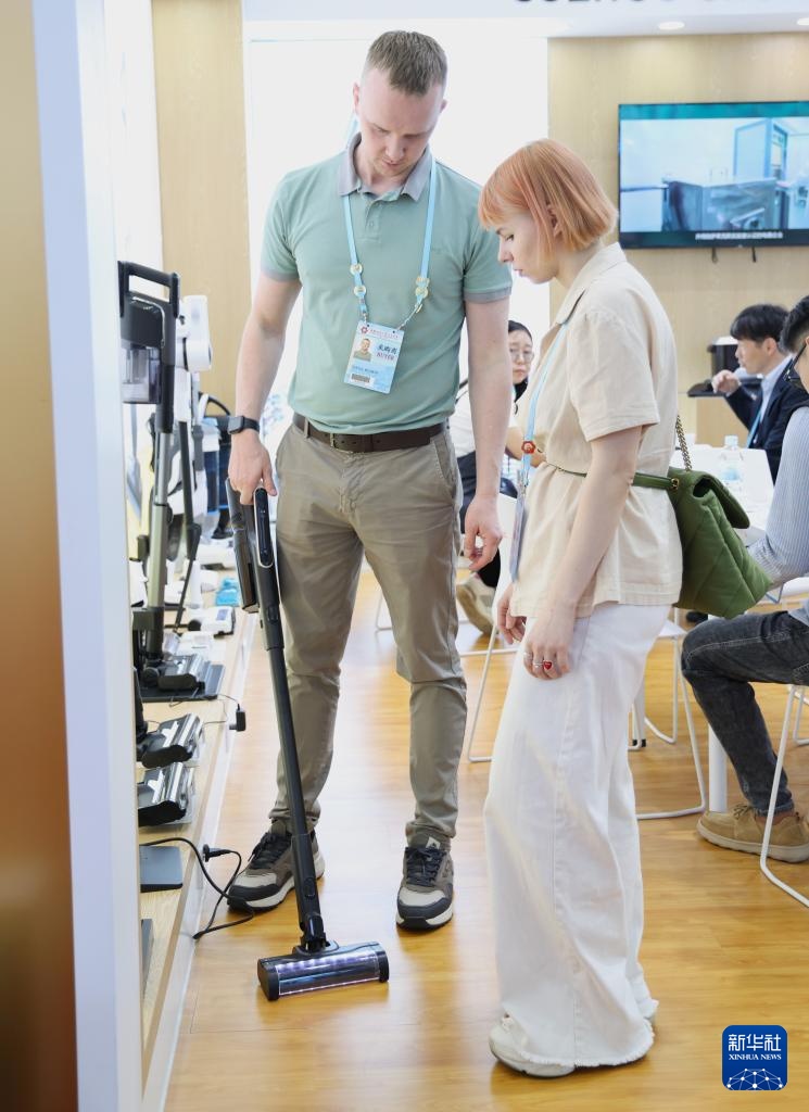 4月16日,客商在广交会上参观体验一款吸尘器。
