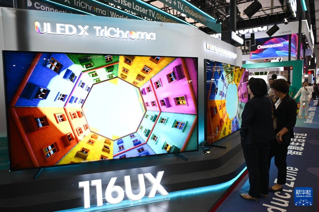 4月16日,在第137届广交会的智慧生活专区,观众观看大尺寸电视产品。