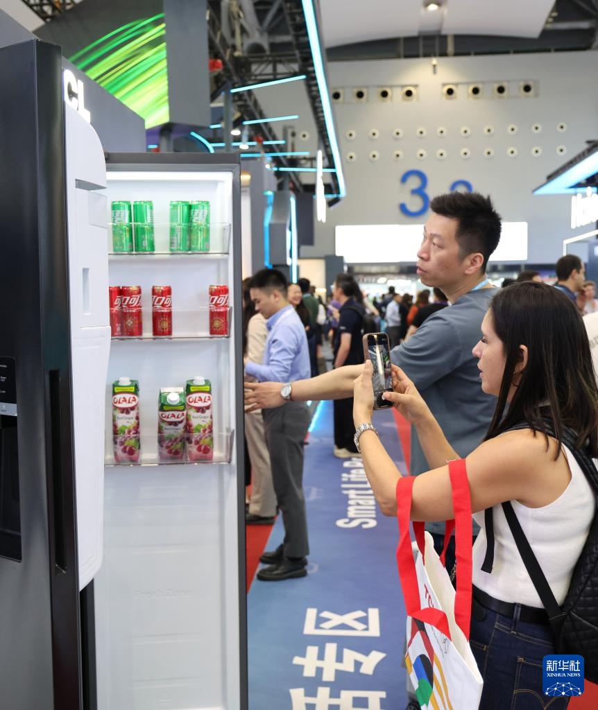 4月16日,客商在广交会上参观了解一款智能冰箱。