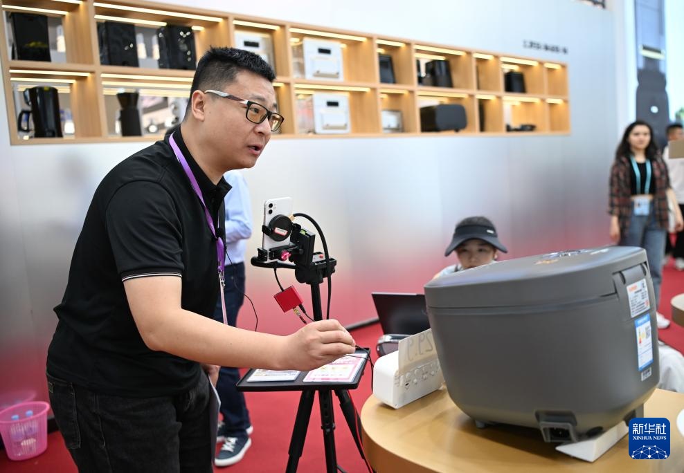 4月16日,在第137届广交会上,苏泊尔展台工作人员在直播电饭煲产品。