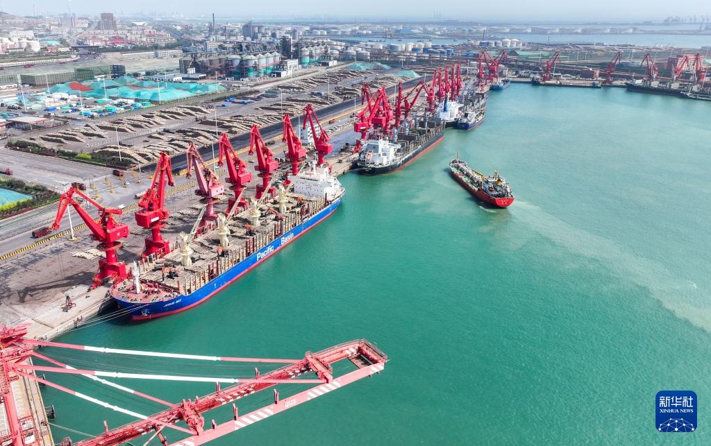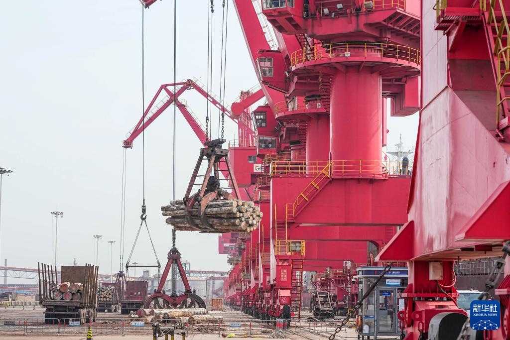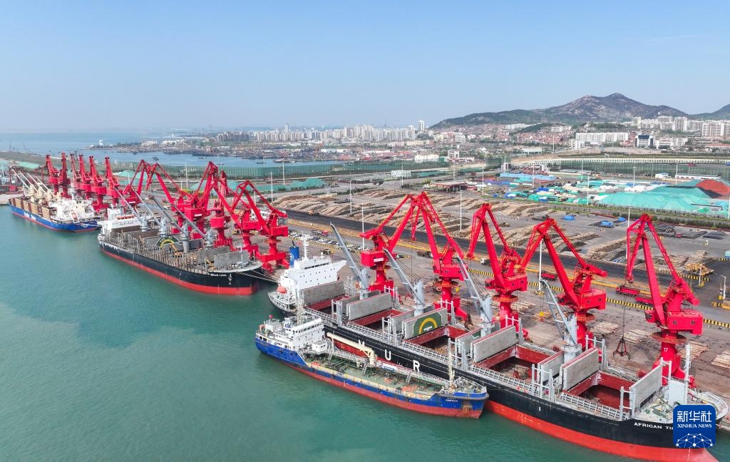 4月16日,在山东港口日照港岚山港区,运载原木的外轮进行卸载作业(无人机照片)。