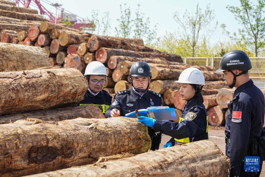 4月16日,在山东港口日照港岚山港区,日照出入境边防检查站民警和日照海关查验关员联合查验进口原木。
