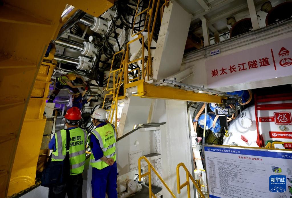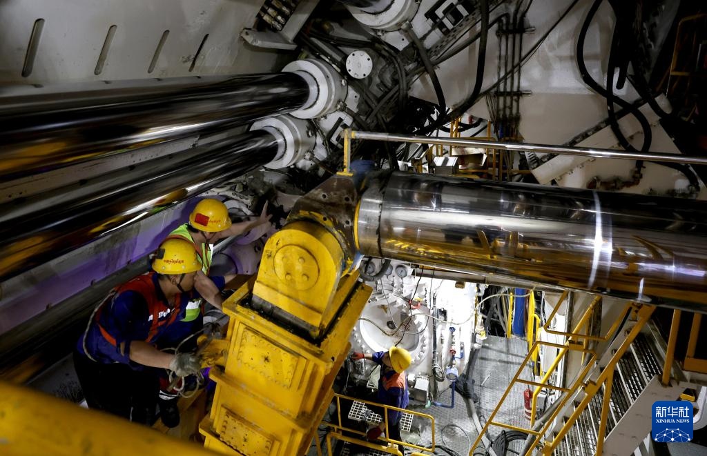 4月16日,技术工人在“领航号”盾构机刀盘后部进行施工作业。