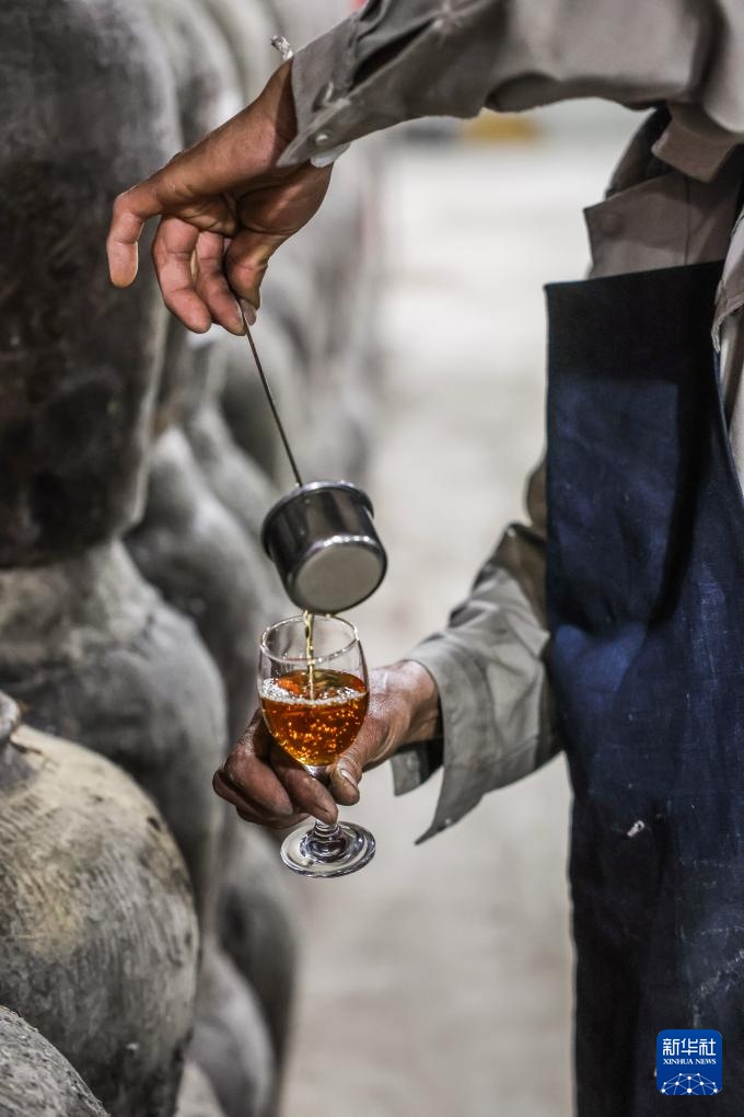 4月16日,在嘉兴南湖区湘家荡农业加工园的老字号企业嘉兴酒厂的地下酒库内,工人在开坛检查年份黄酒的色香味。