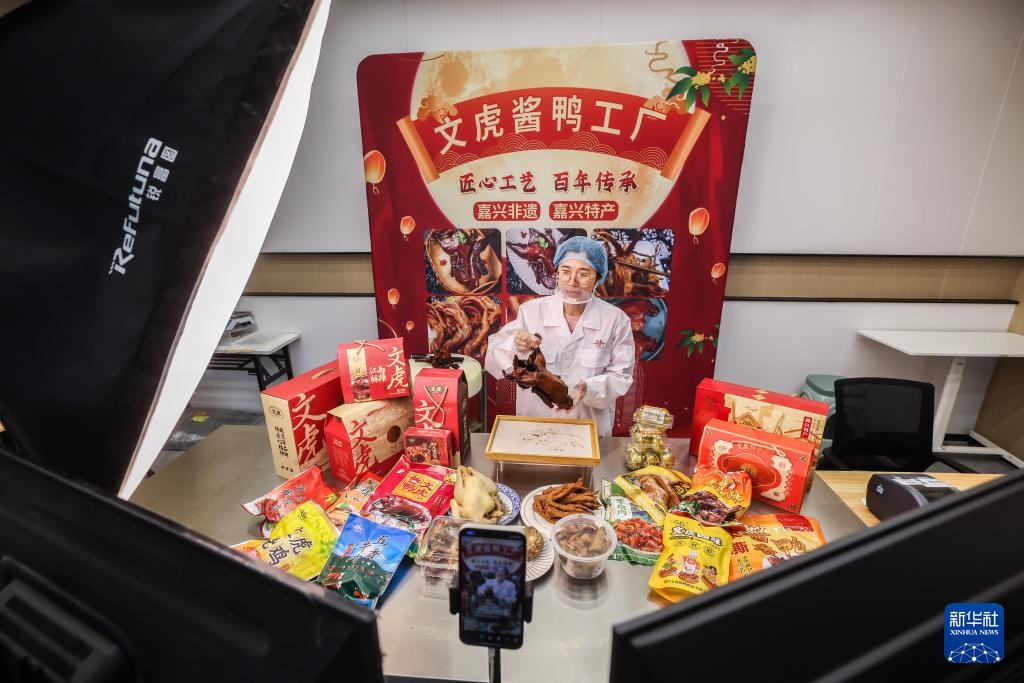 4月16日,在位于嘉兴南湖区湘家荡农业加工园的老字号企业嘉兴文虎酱鸭股份有限公司直播间内,工作人员在直播销售酱鸭。