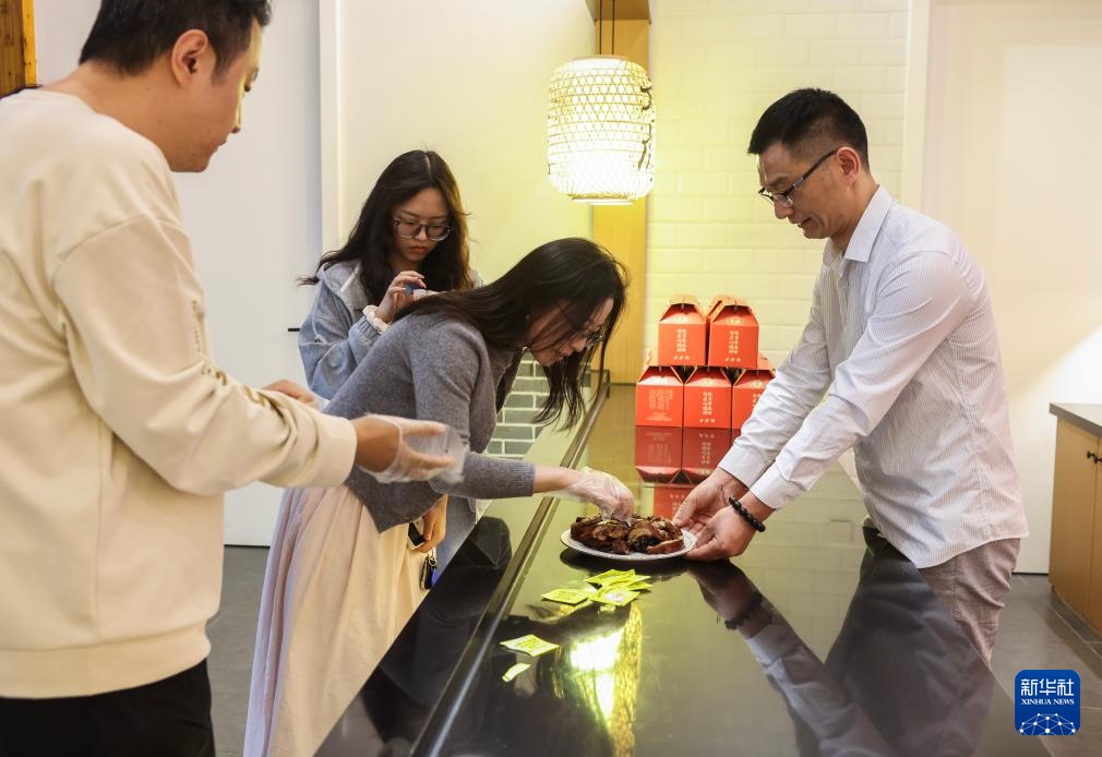 4月16日,在位于嘉兴南湖区湘家荡农业加工园的老字号企业嘉兴文虎酱鸭股份有限公司内的文虎酱鸭博物馆,游客在品尝文虎酱鸭。