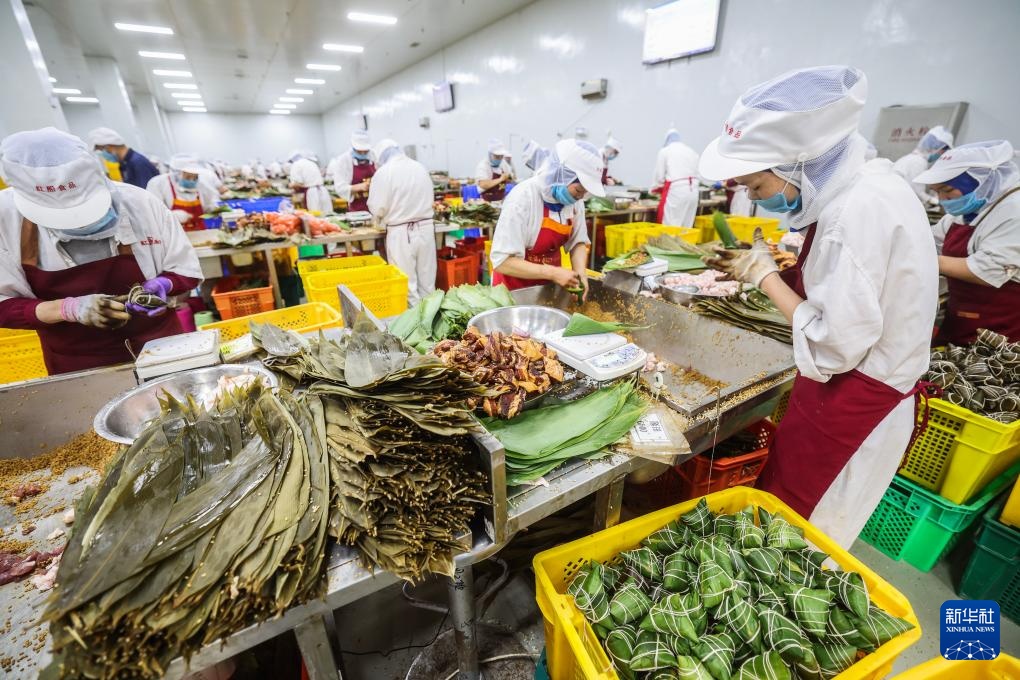 4月16日,在位于嘉兴南湖区湘家荡农业加工园的老字号企业南湖斋食品股份有限公司裹粽车间内,员工在包手工粽子。