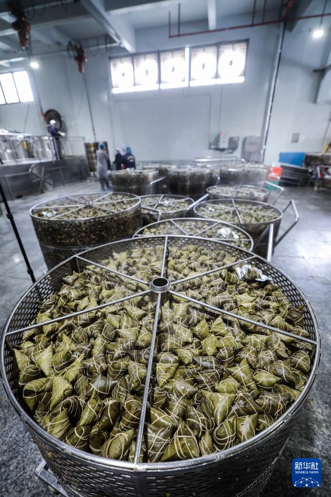 4月16日,在位于嘉兴南湖区湘家荡农业加工园的老字号企业南湖斋食品股份有限公司煮粽车间内,工人操作数字化煮粽系统煮粽子,每个大锅一次可以煮约5000个粽子。