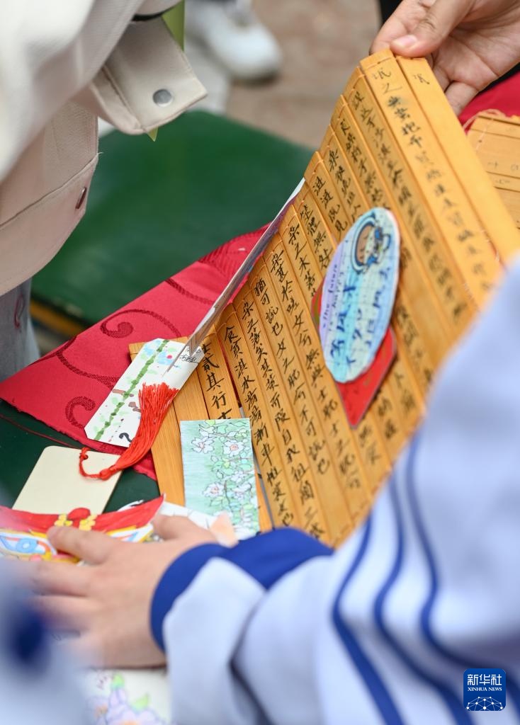 这是学生在读书日系列活动中自制的竹简(4月16日摄)。