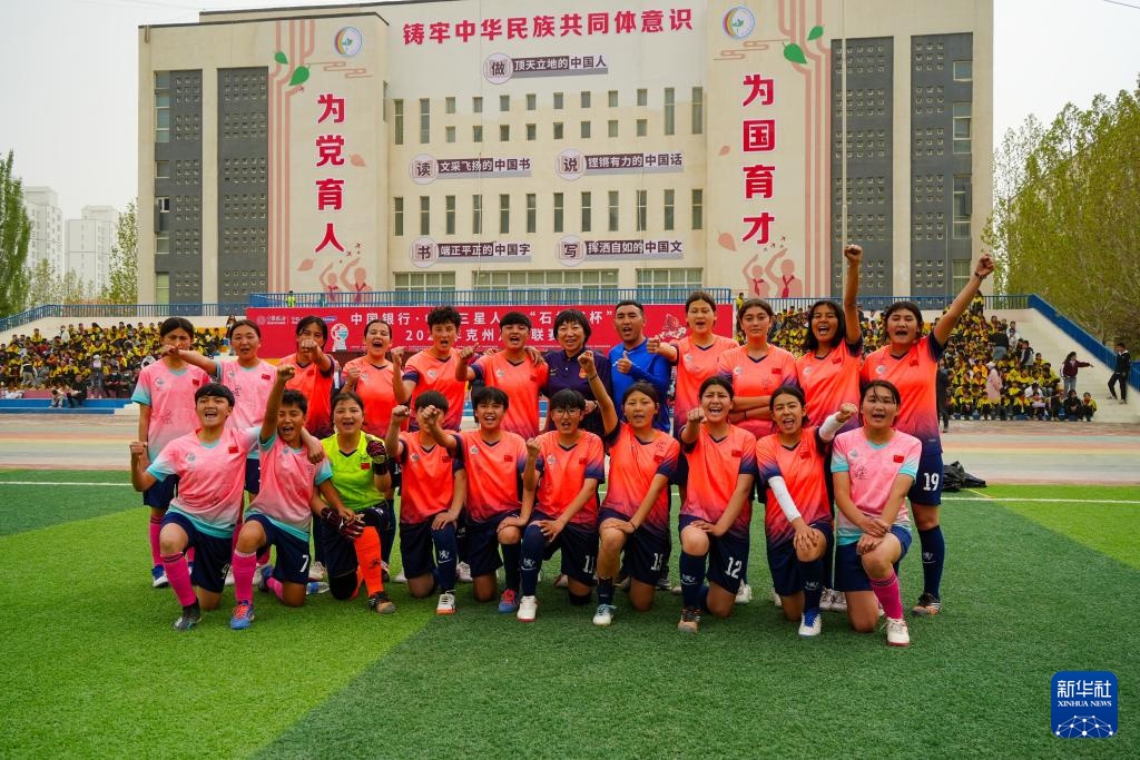 这是在2025新疆克孜勒苏柯尔克孜自治州足球联赛开幕式上,中国足协副主席、前中国国家女子足球队球员孙雯(前中)与阿图什市U13女子足球队合影(4月12日摄)。