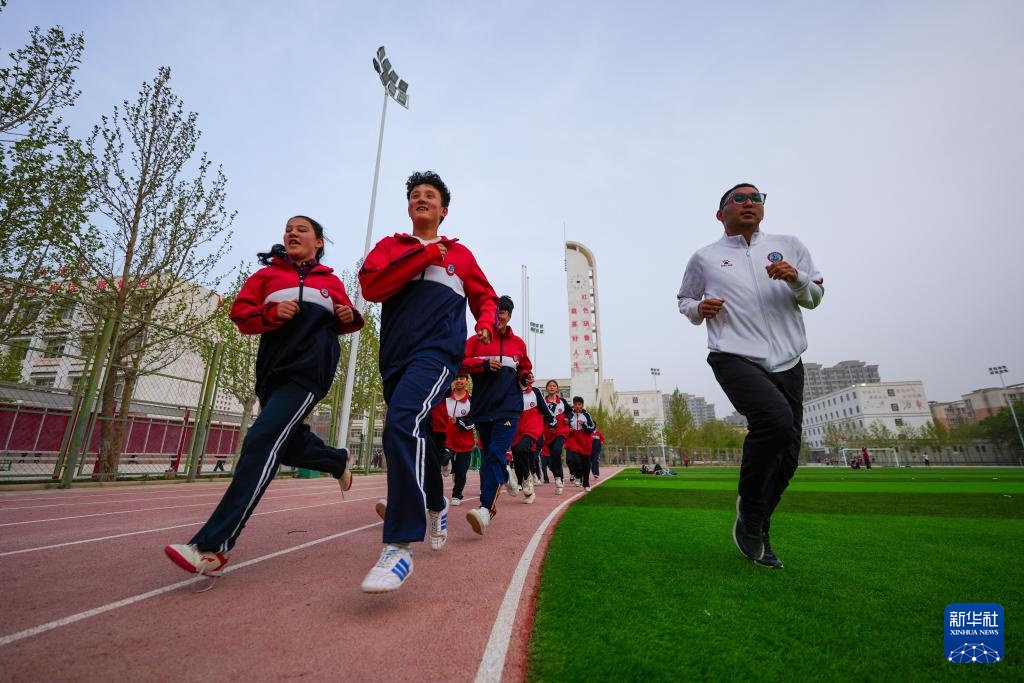 这是在阿图什市硝鲁克中学,教练如扎吉·艾麦提江(右)带领阿图什市U13女子足球队球员进行跑步训练(4月14日摄)。