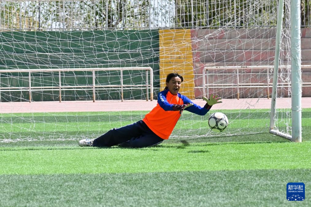 这是在阿图什市硝鲁克中学,阿图什市U13女子足球队守门员艾妮再·阿布都如苏力进行扑救训练(4月10日摄)。