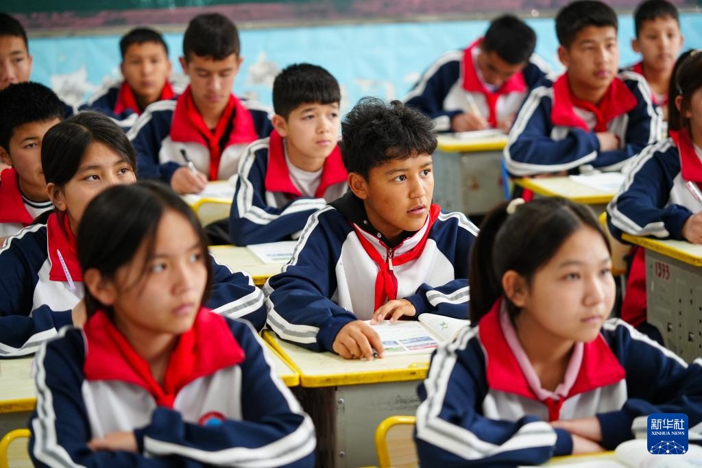 这是在阿图什市硝鲁克中学,阿图什市U13女子足球队前锋谢尔克努尔·亚力坤(二排左二)在教室里上课(4月14日摄)。