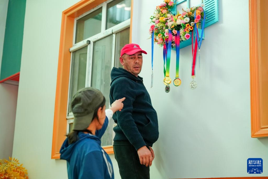 这是在阿图什市亚喀巴格村,阿图什市U13女子足球队球员乃菲赛·阿布都外力的父亲帮女儿整理奖牌和参赛证件(4月13日摄)。