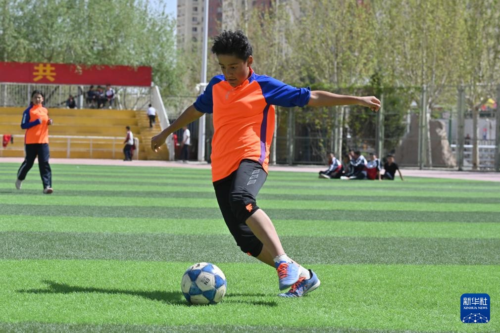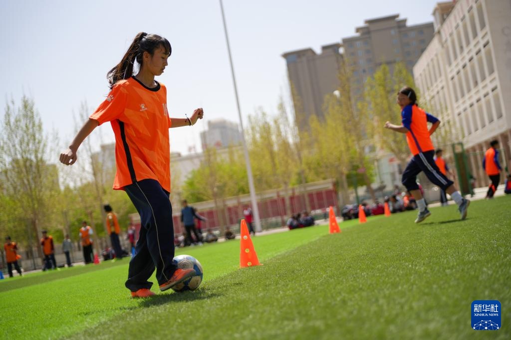 这是在阿图什市硝鲁克中学,阿图什市U13女子足球队中场球员帕提麦·肉孜买买提在进行运球训练(4月10日摄)。