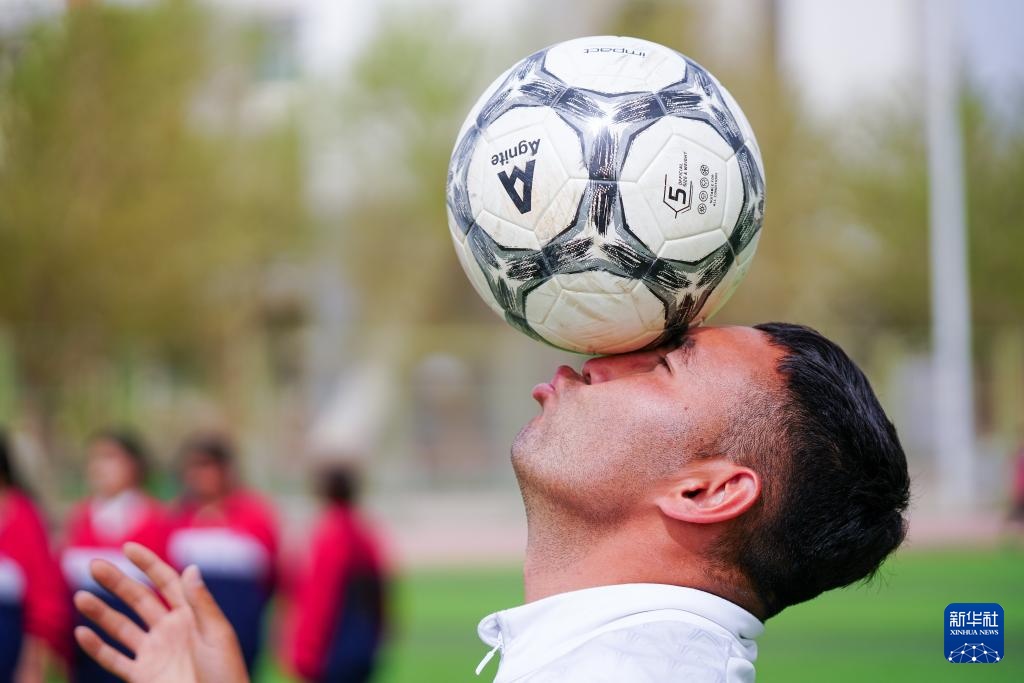 这是在阿图什市硝鲁克中学,教练如扎吉·艾麦提江为队员演示头部停球(4月14日摄)。