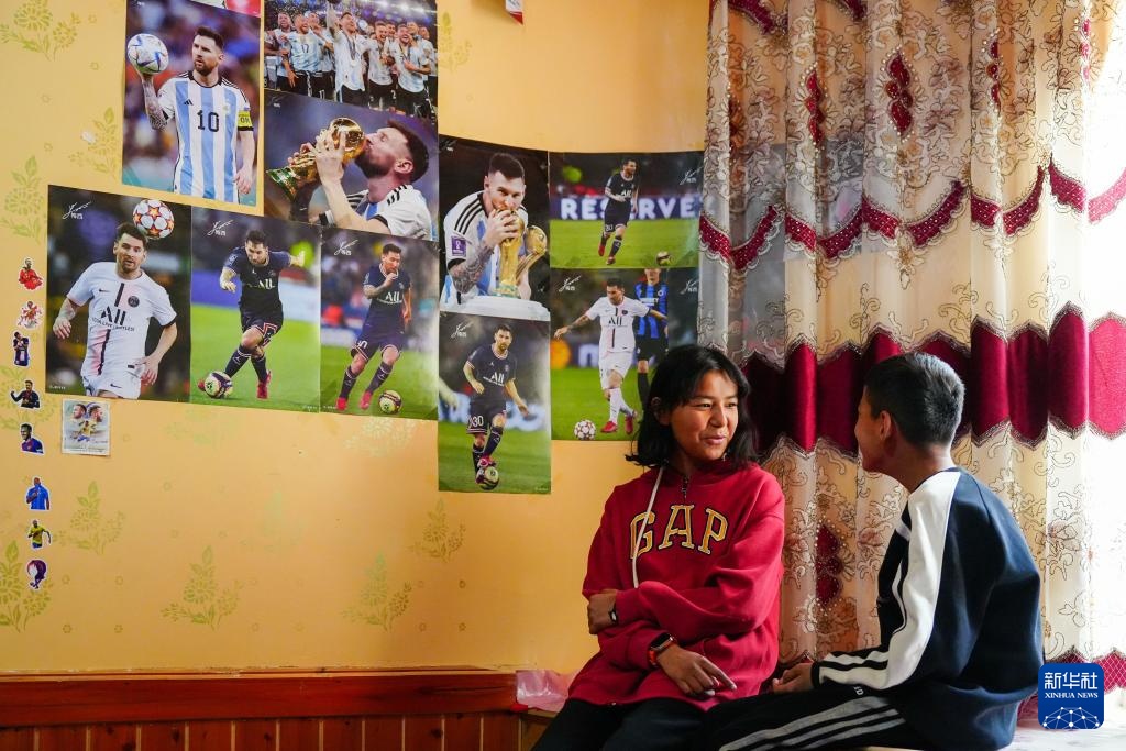 这是在阿图什市亚喀巴格村,阿图什市U13女子足球队球员艾妮再·阿布都如苏力(左)在家中与弟弟聊天(4月13日摄)。