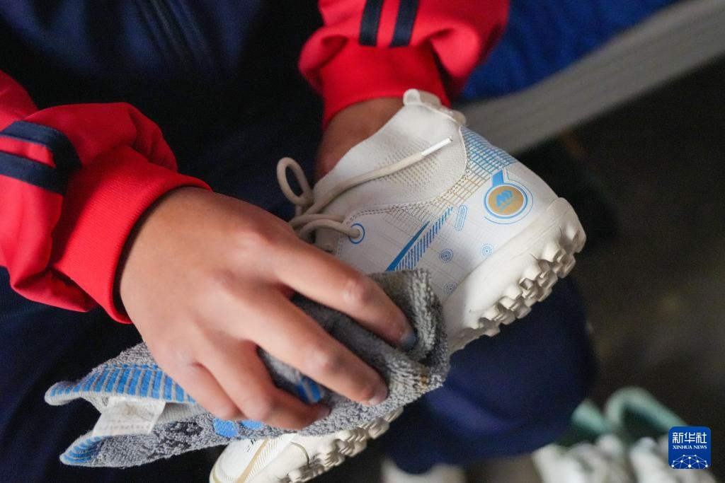 这是在阿图什市硝鲁克中学的宿舍里,一名球员在擦拭自己的球鞋(4月10日摄)。
