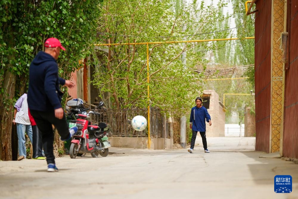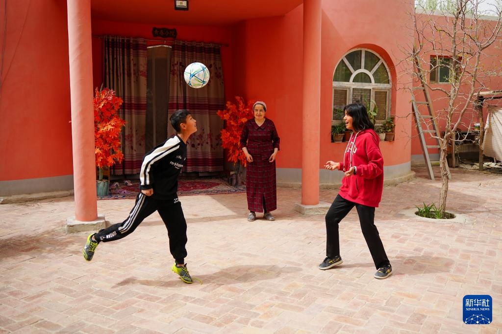 这是在阿图什市亚喀巴格村,阿图什市U13女子足球队球员艾妮再·阿布都如苏力(右)在家中的院子里和母亲、弟弟踢球(4月13日摄)。