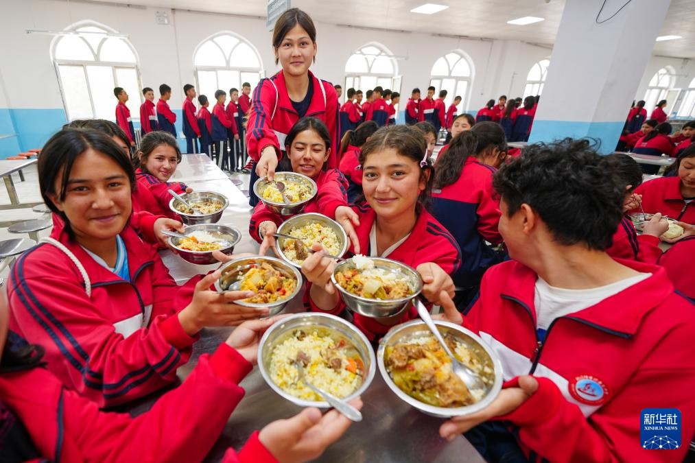 这是在阿图什市硝鲁克中学的食堂里,阿图什市U13女子足球队的队员们展示午餐(4月14日摄)。