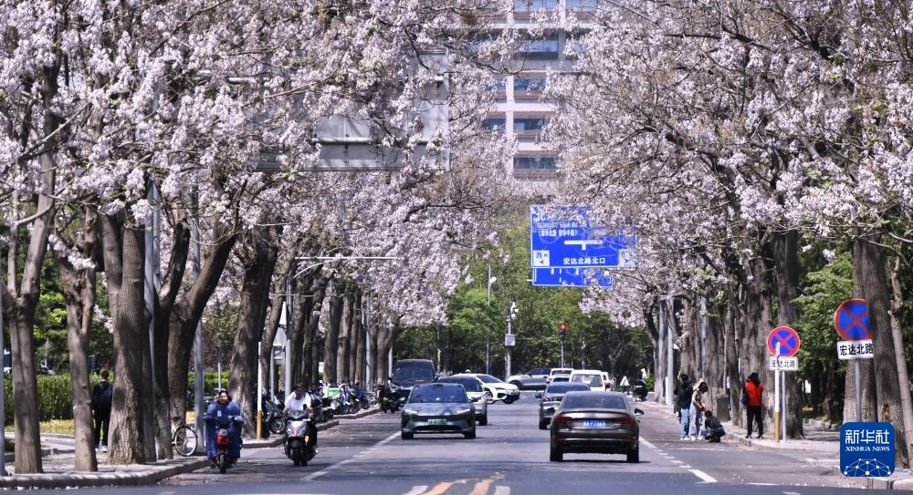 4月17日拍摄的泡桐花盛开的宏达路。