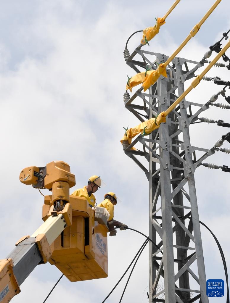 4月17日,在海南省陵水黎族自治县华电陵水59.9MW分布式光伏发电项目现场,电力工作人员进行带电接火作业。