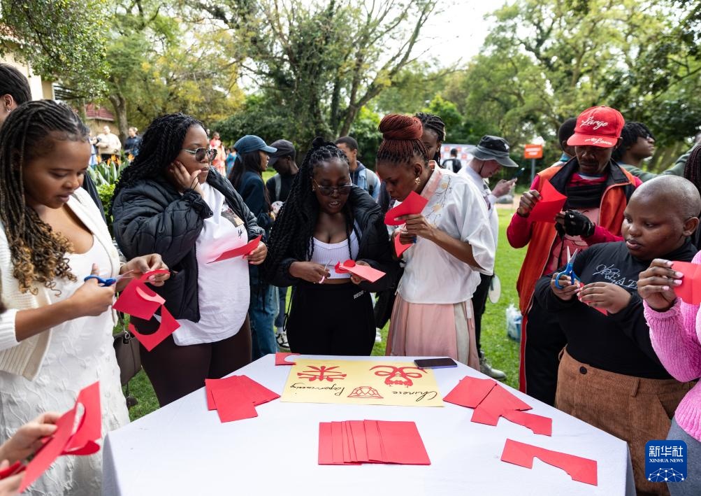 4月17日,在南非约翰内斯堡,学生与孔子学院志愿者在“国际中文日”活动上展示剪纸。