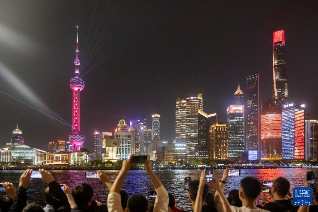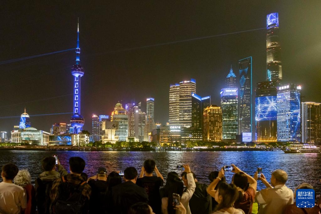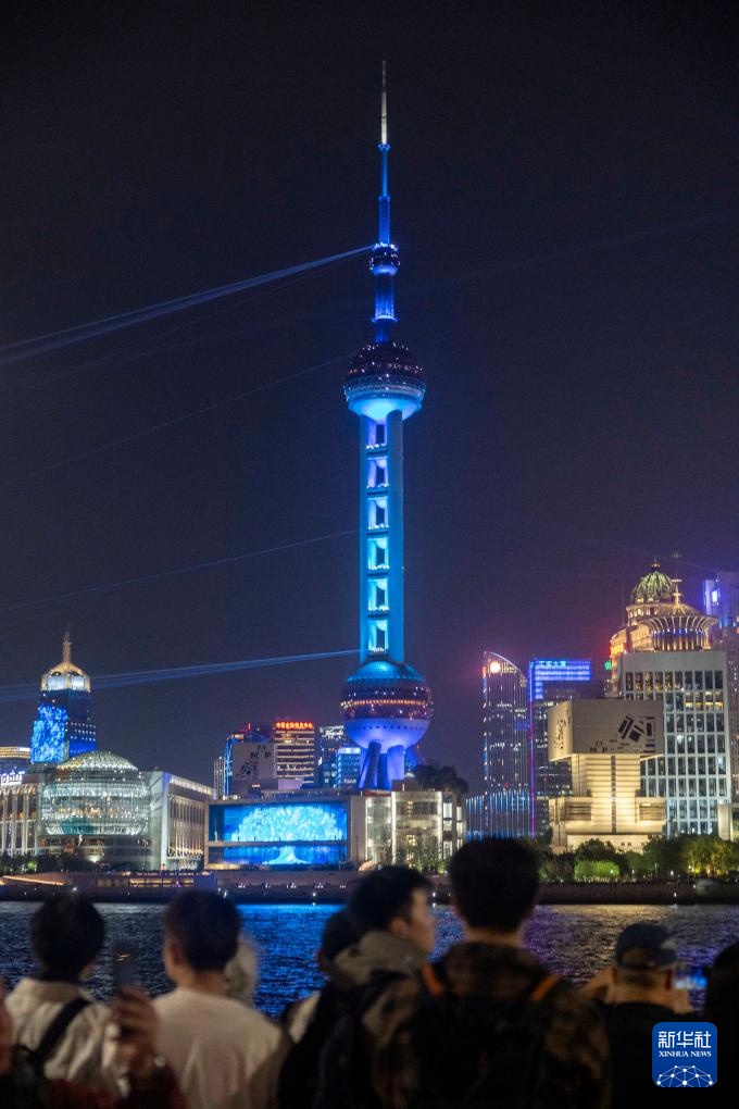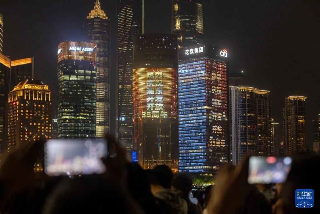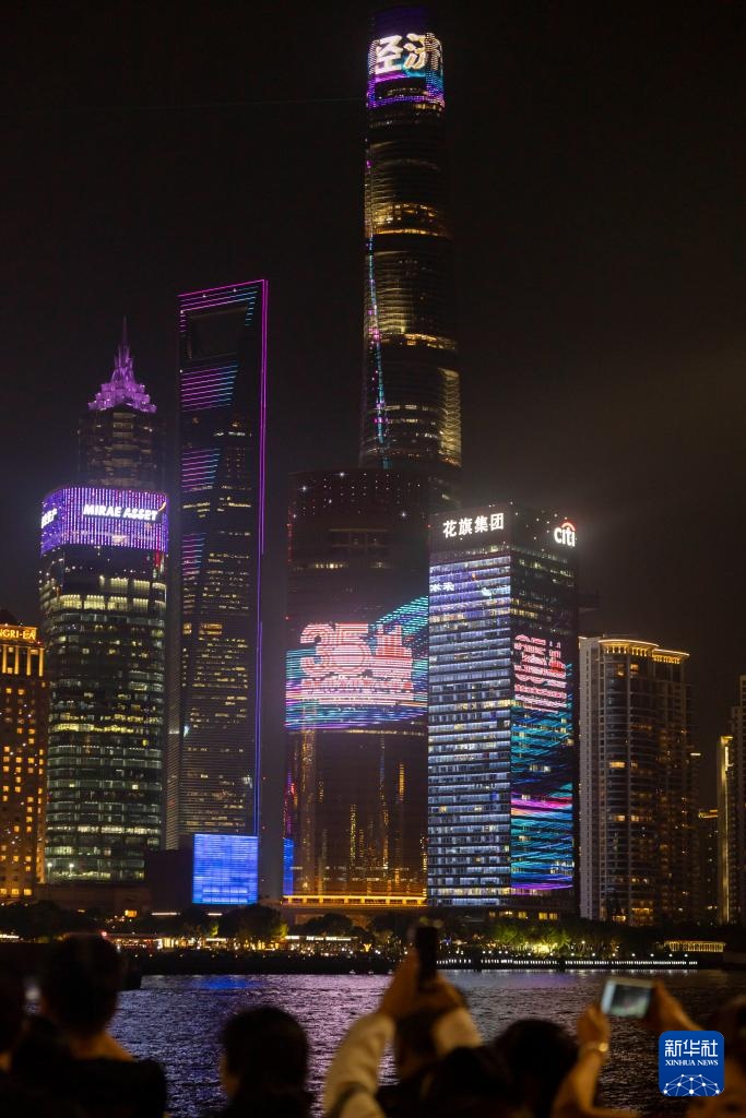4月17日,人们在上海外滩拍摄对岸陆家嘴庆祝浦东开发开放35周年光影秀。