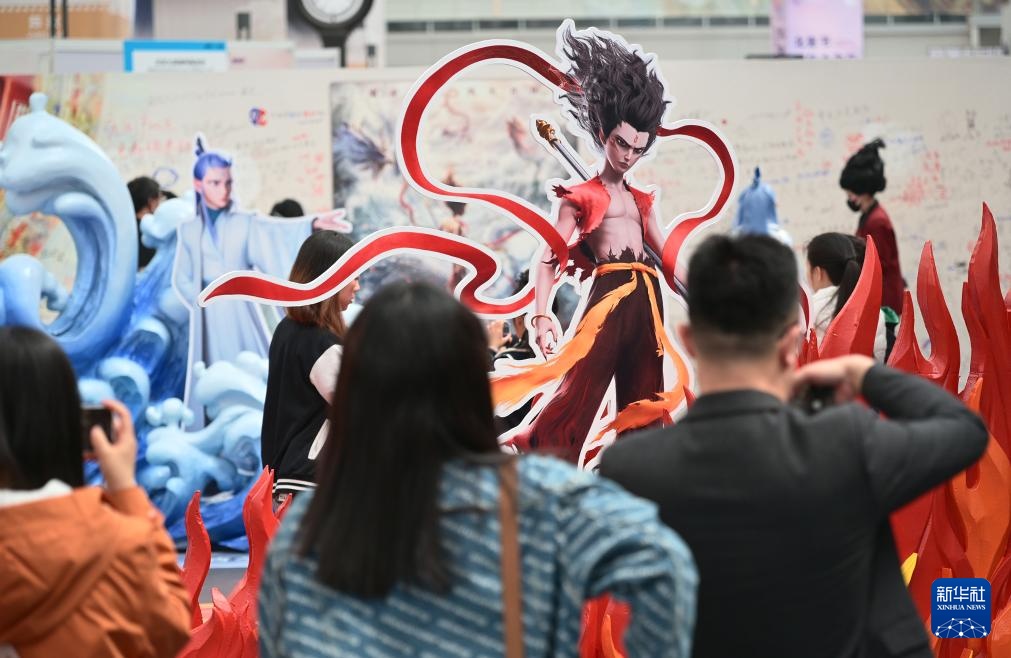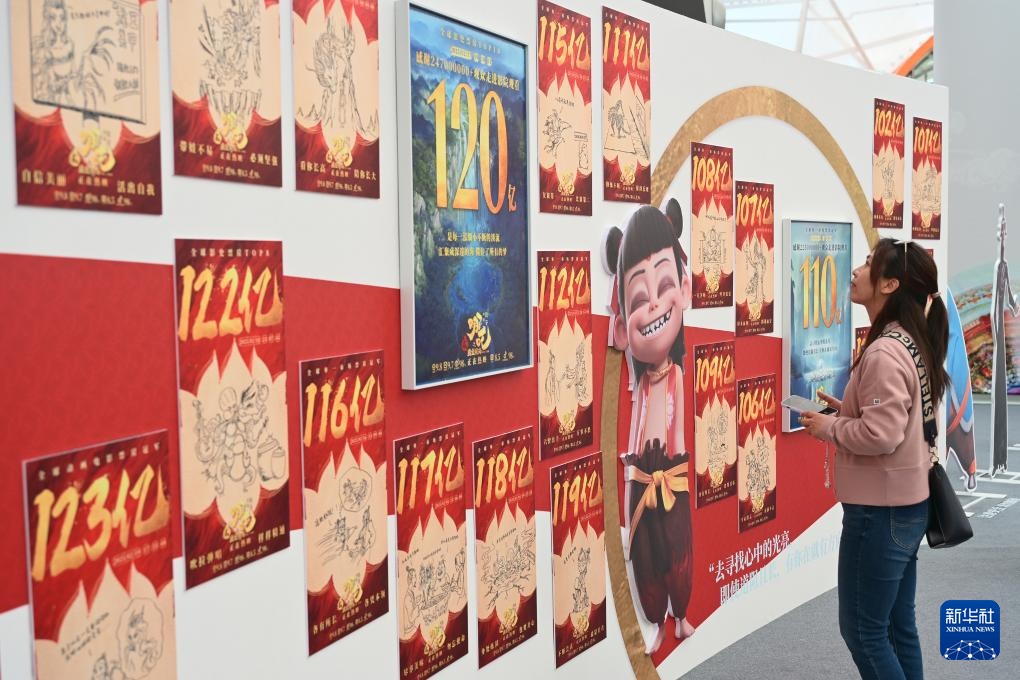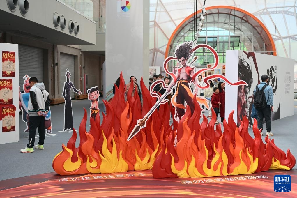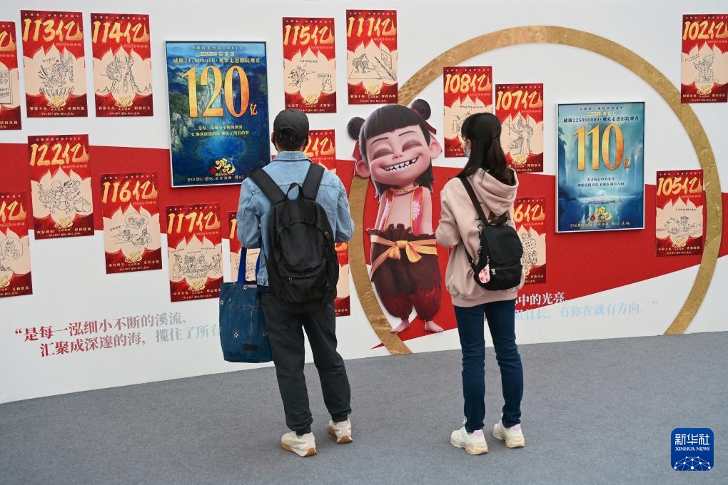 4月19日,观众从电影《哪吒之魔童闹海》破亿手绘海报展展示的电影衍生文创产品前走过。