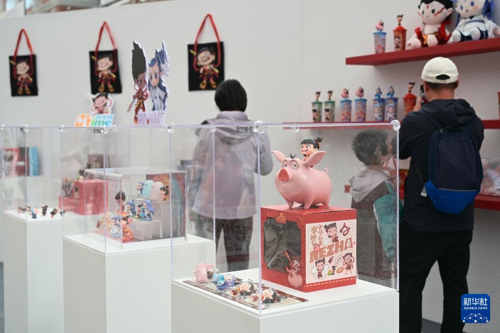 这是电影《哪吒之魔童闹海》破亿手绘海报展上展示的电影衍生文创产品(4月19日摄)。