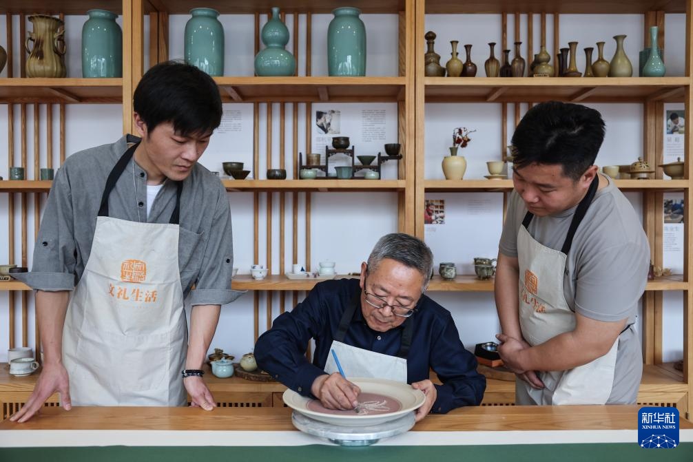 4月19日,浙江省工艺美术大师邵文礼(中)在婺州窑艺术馆给徒弟示范婺州窑刻花工艺。