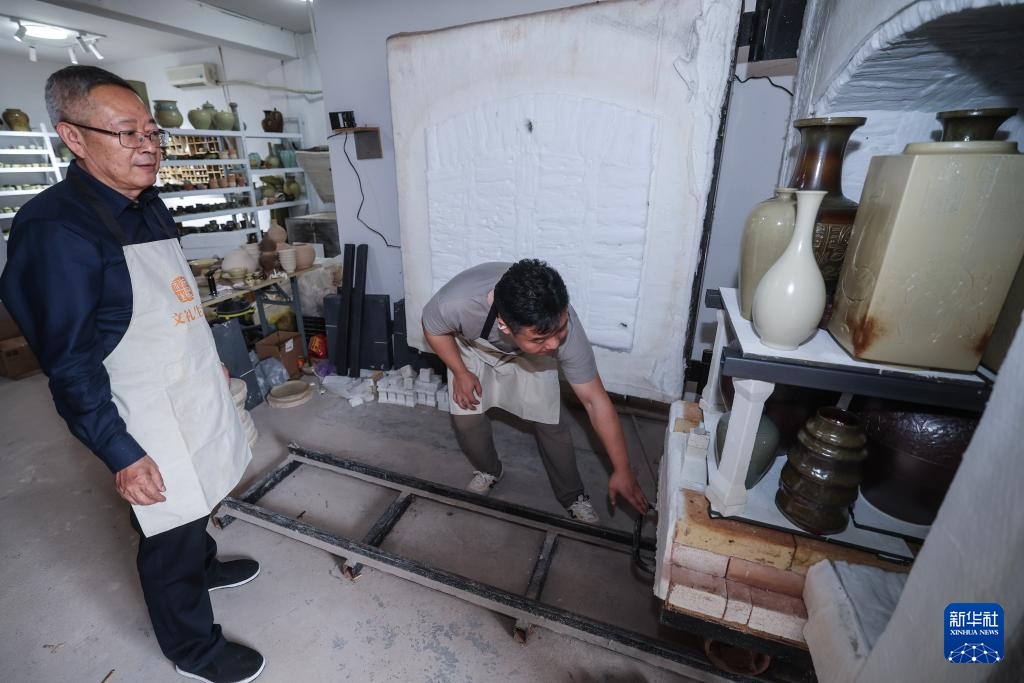 4月19日,浙江省工艺美术大师邵文礼(左)在婺州窑艺术馆的工作室查看徒弟吴超开窑。