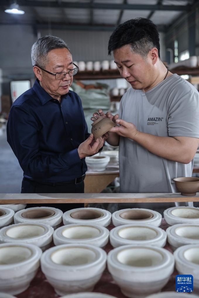 4月19日,浙江省工艺美术大师邵文礼(左)在婺州窑生产车间与徒弟吴超探讨素坯的品控。
