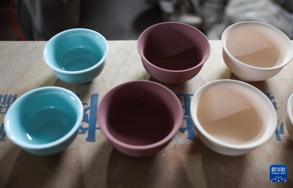 4月19日在金华武义婺州窑生产车间拍摄的婺州窑素坯(右一)、已上釉的素坯(中)和烧制完成的婺州窑器物。