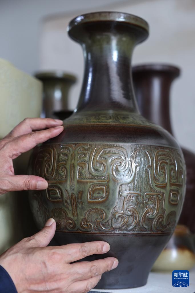 4月19日,浙江省工艺美术大师邵文礼在婺州窑艺术馆给徒弟示范婺州窑刻花工艺。