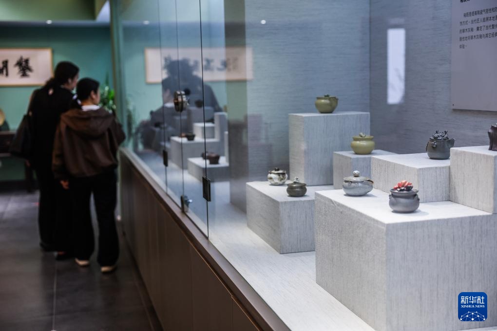4月19日,游客在金华武义溪里村的婺州窑艺术馆参观。