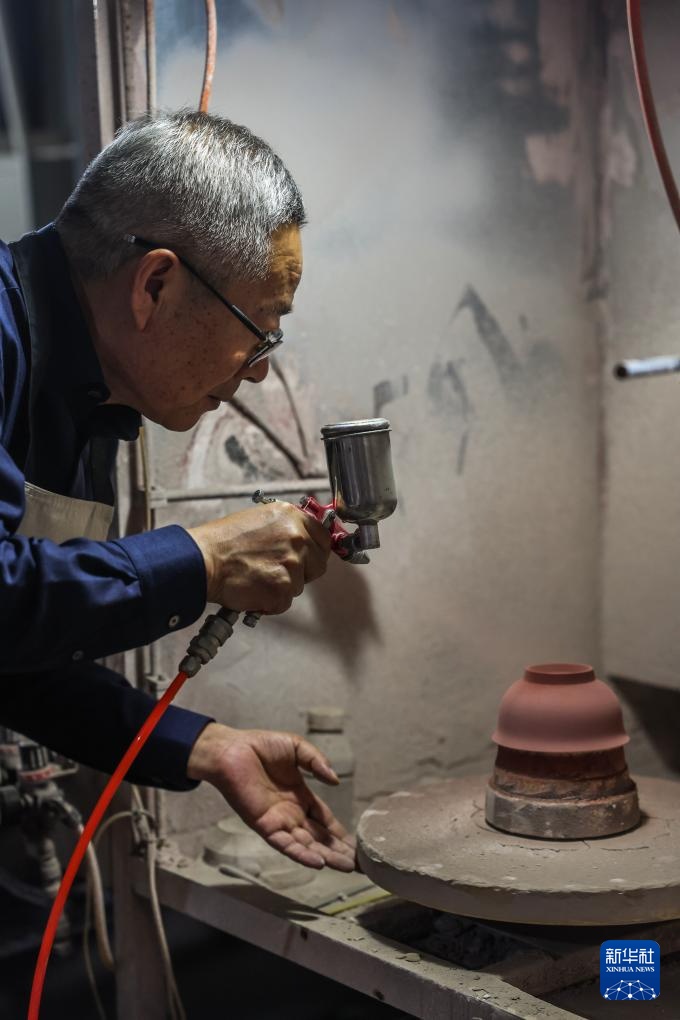 4月19日,浙江省工艺美术大师邵文礼在婺州窑生产车间给素坯上釉。