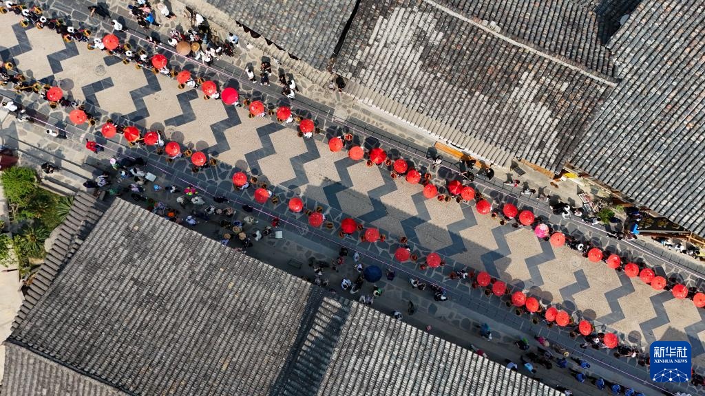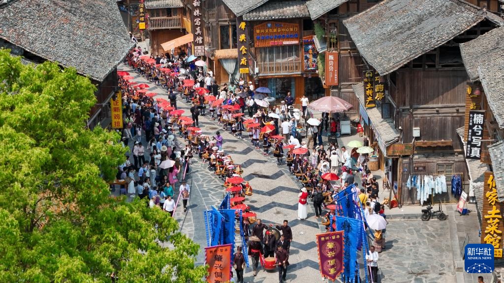 4月19日,在贵州省黎平县肇兴侗寨,侗族群众身着节日盛装参加巡游活动(无人机照片)。