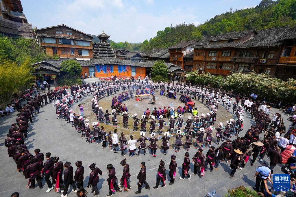 4月19日,在贵州省黎平县肇兴侗寨,侗族群众身着节日盛装参加踩歌堂活动。