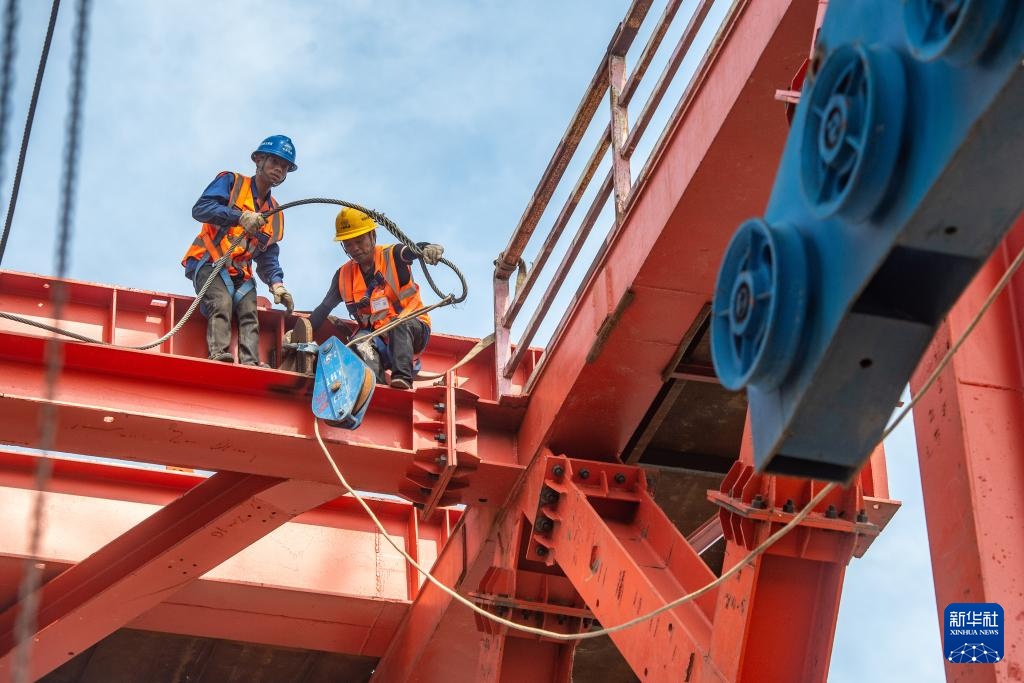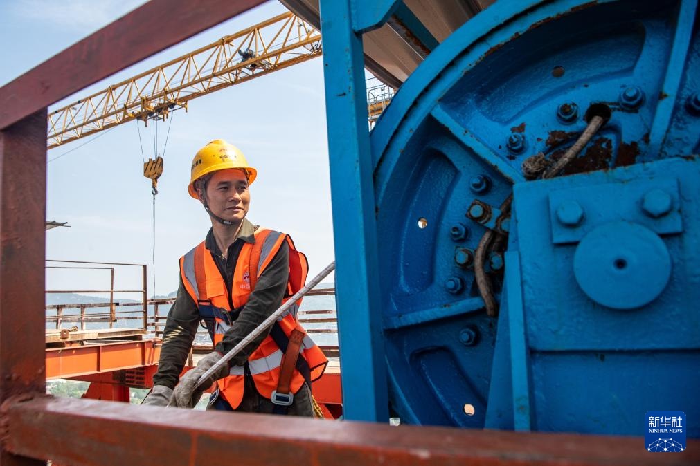 4月19日,在重庆黄桷沱长江大桥建设现场,工人在架设先导索。