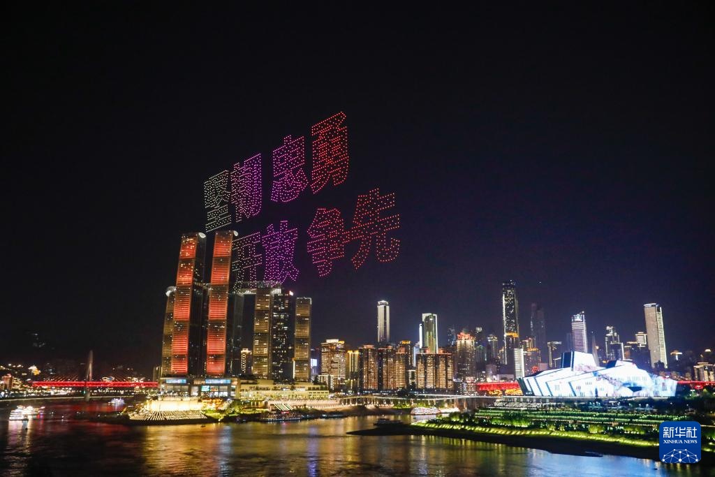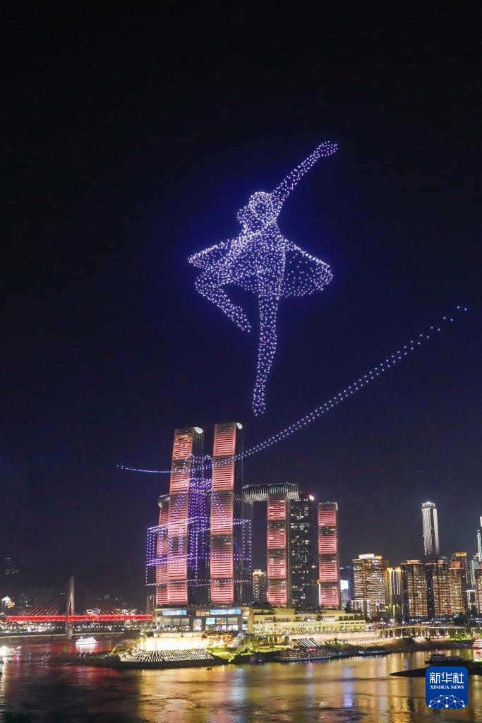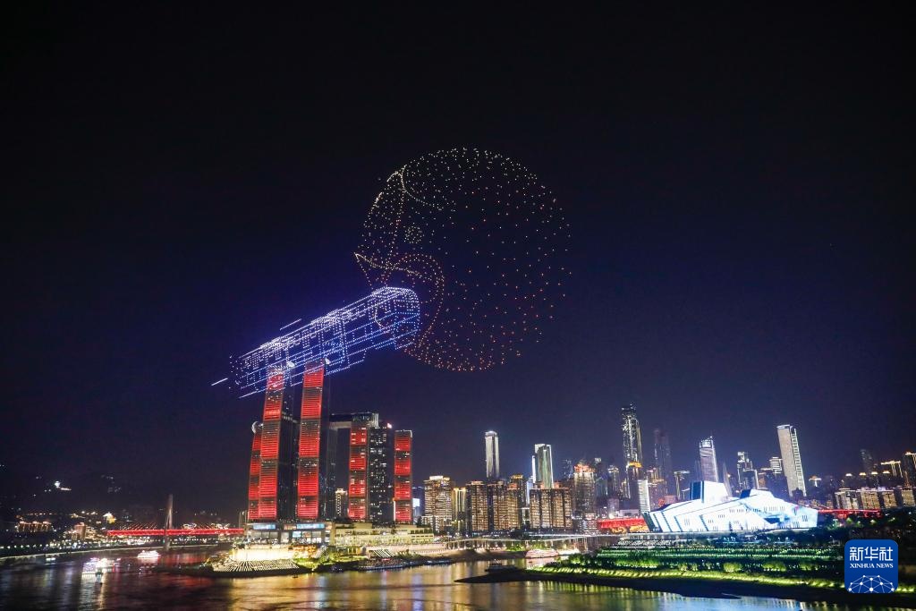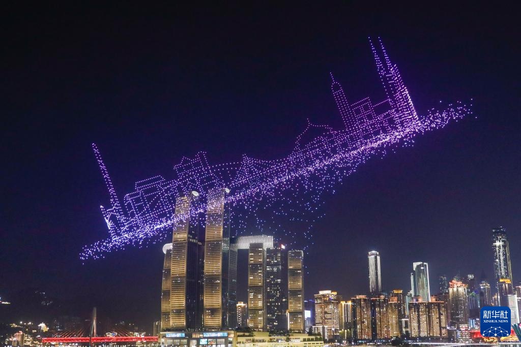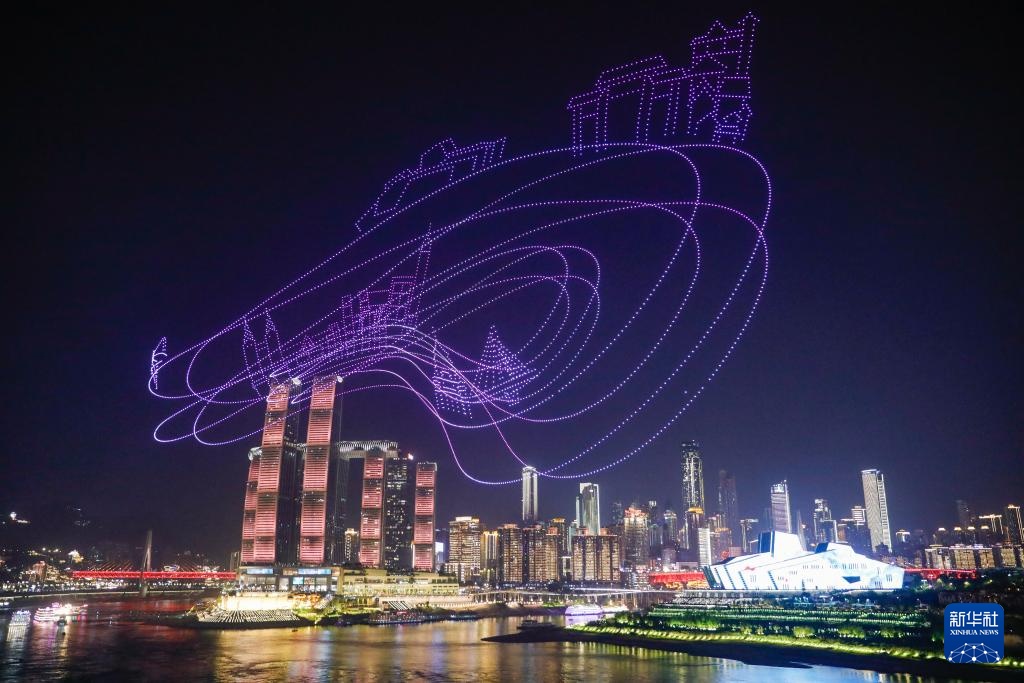 这是4月19日晚在重庆市南岸区拍摄的“魅力重庆”常态化无人机灯光秀首场展演。