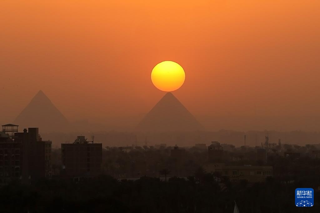这是4月19日在埃及开罗拍摄的吉萨金字塔群日落景色。