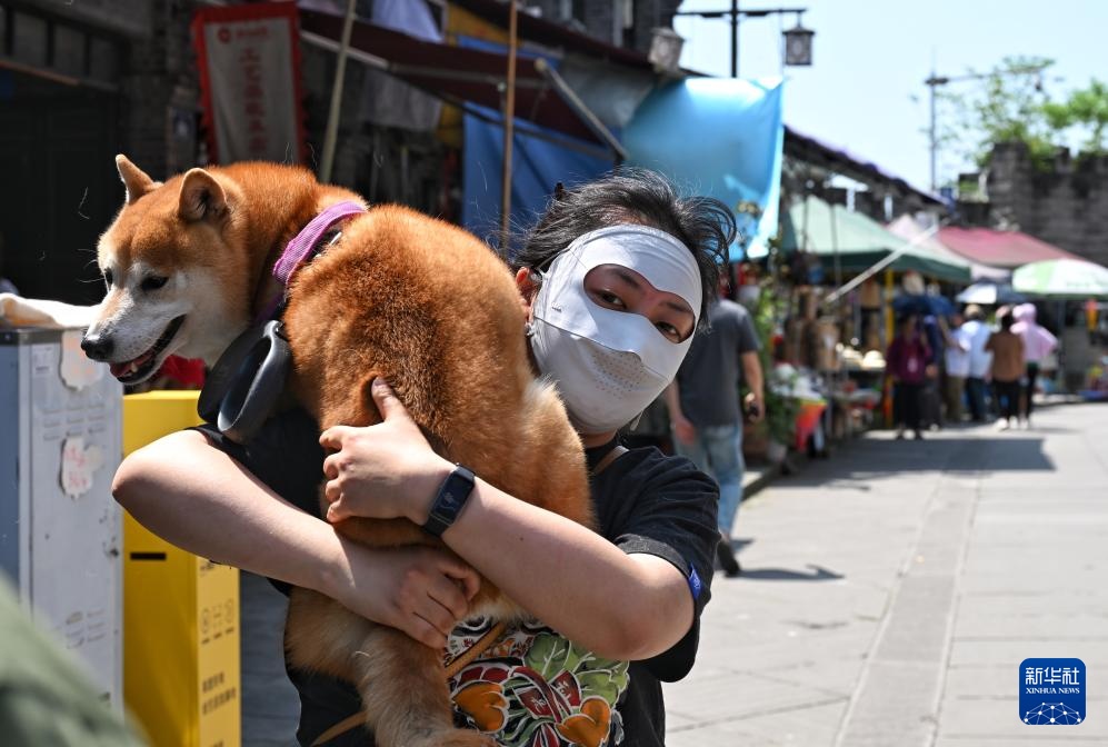 4月20日是二十四节气的谷雨,重庆市最高气温达到34摄氏度。在荣昌区万灵古镇,主人担心路面太烫,抱着宠物犬在街面行走。