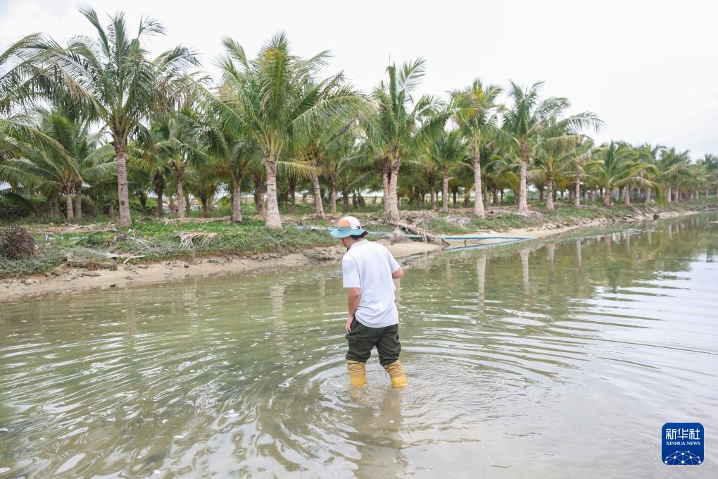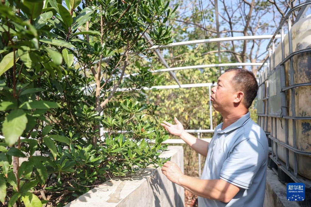 4月9日,曾德华在三亚市林业科学研究院的人工潮汐池查看红榄李的生长情况。