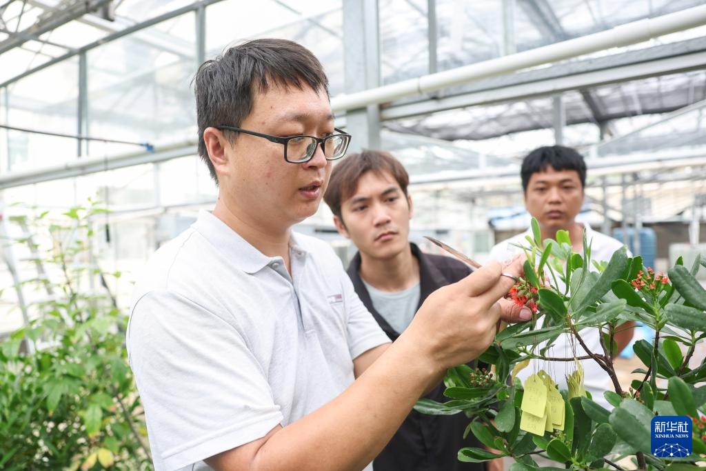4月10日,三亚市林业科学研究院技术员王炳宇在温室大棚内对红榄李进行人工授粉实验。