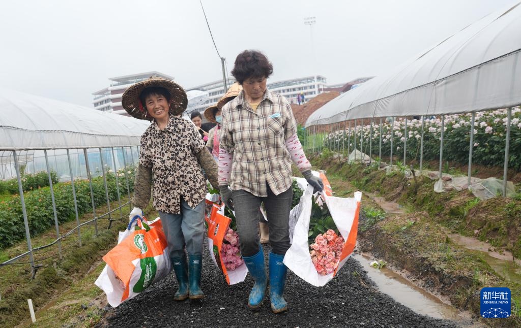 4月22日,在龙游县初见玫瑰园,在此就业的农户将刚采摘的月季送至打包区域。