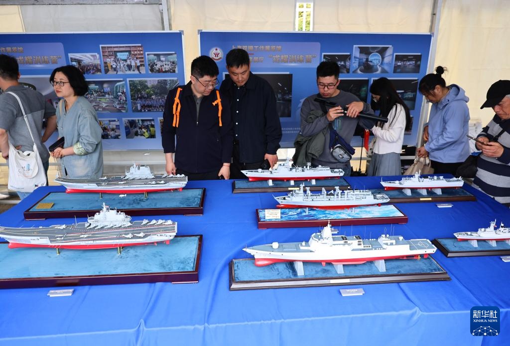4月22日,市民游客在国防教育区内观看舰船模型。