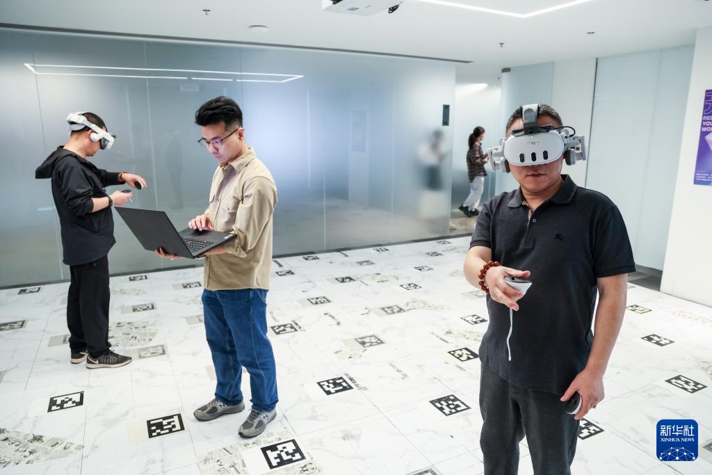 在位于深圳市南山区的元象科技实验室,研发人员进行VR设备测试(3月4日摄)。